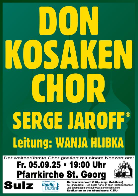Dieser grandiose Weltklasse-Chor, bekannt aus unzähligen Fernsehsendungen und CD Einspielungen, wird im September, getragen von der Begeisterung seines Publikums, stimmgewaltig mit einem bravourösen neuen Konzert-Programm erstmals in Sulz gastieren und wir freuen uns natürlich ganz besonders, dass dieses Konzert stattfinden kann. Es werden ausschließlich ukrainische Sänger dem Chor angehören. Ein musikalisches Fest großer Stimmen und inniger Gesänge erwartet die Zuhörer.